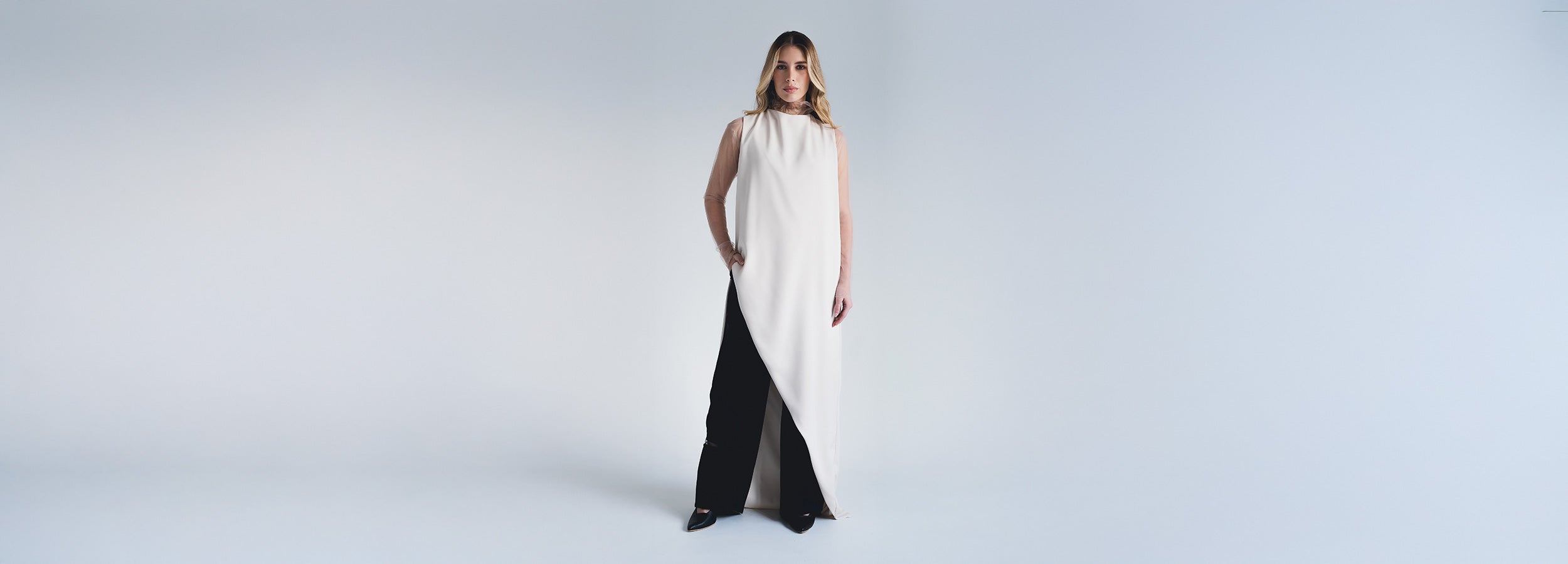 A fluid blouse crafted from Vienna Nights, a fabric with a subtle pearlescent sheen that evokes the purity of starlight. The asymmetrical front slit adds dynamism and subtly reveals the silhouette as you walk. At the back, a majestic star-shaped slit—The Etùal—becomes the focal point of the design, leaving the back bare with a perfect balance of minimalism and drama.