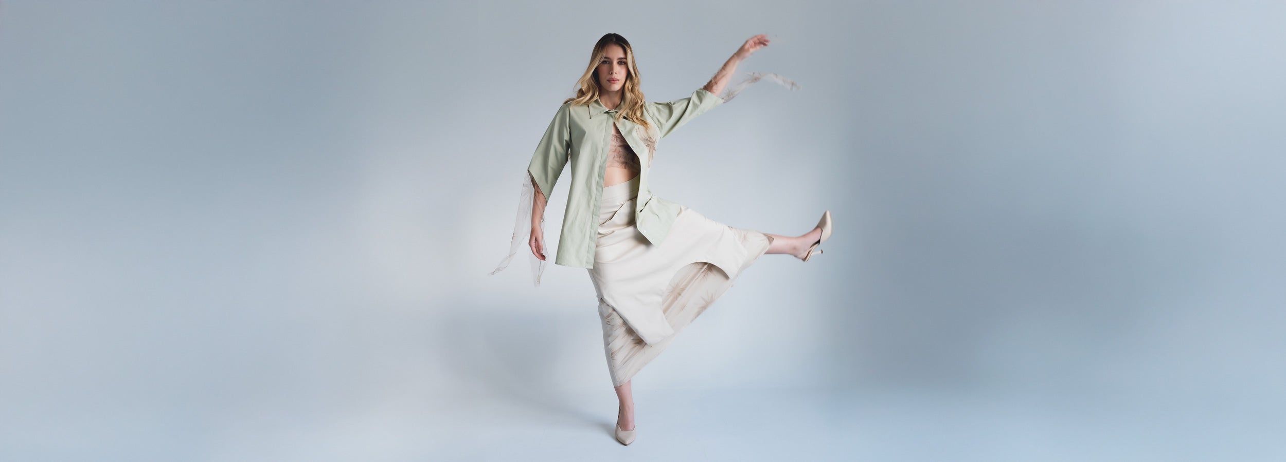 The ASTRALIS look is an evocative symphony of green hues that dances between transparency and volume. This ensemble stands out for its ethereal prints reminiscent of a starry sky, creating an illusion of depth and lightness. The sheer layers play with the light, subtly revealing skin and generating a play of layering that enriches the look's aesthetic. The asymmetrical cuts and wraparound silhouettes add dynamism and movement, while the mix of textures creates a fascinating contrast between opacity and transparency.