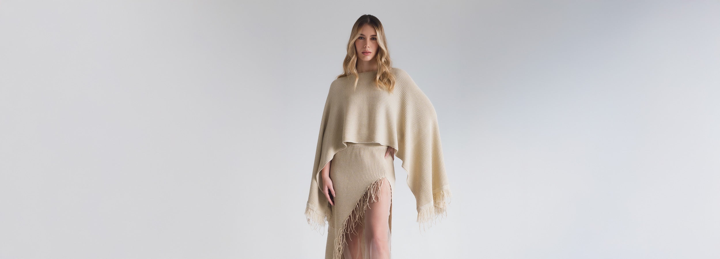 This look explores the duality between structure and lightness, combining contrasting textures in a monochromatic harmony of beige and sand tones. The silhouette plays with controlled volumes, ethereal layers, and handcrafted finishes that elevate each piece to a sophisticated expression of design and technique.