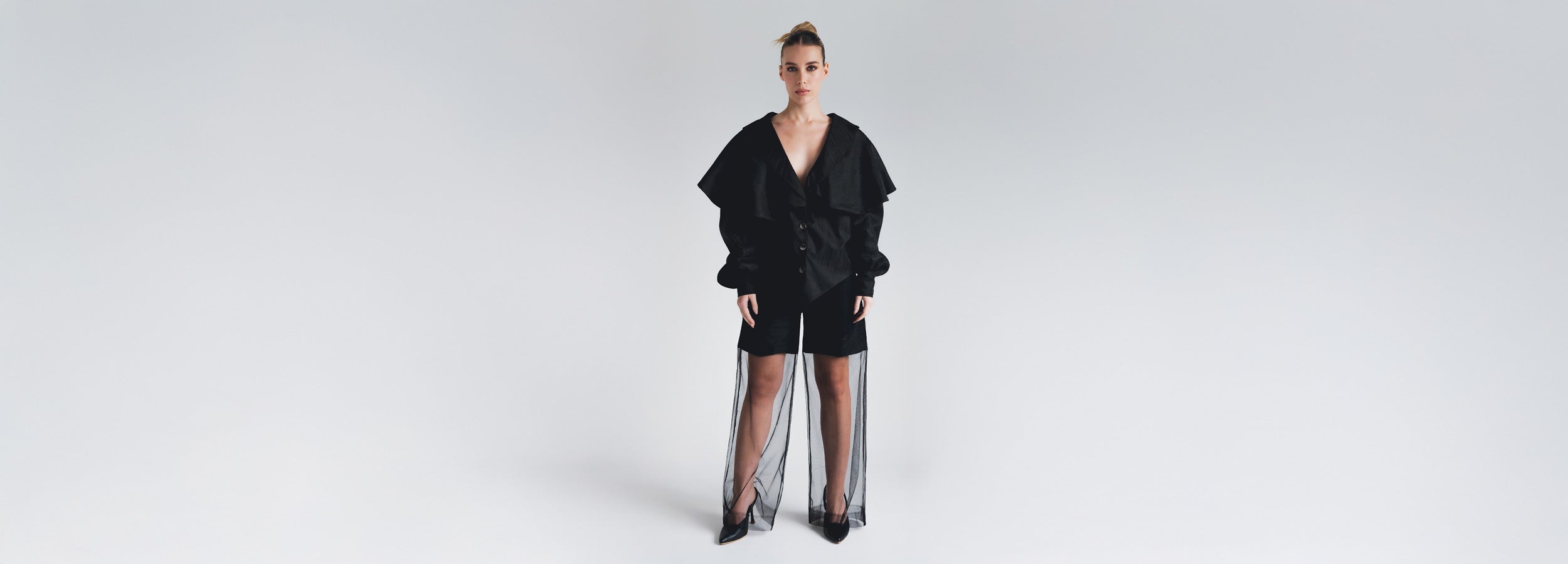 The CELESTIA look is a celebration of black, a color that evokes mystery and sophistication. The generous volumes of the textured fabrics create an enveloping silhouette that redefines proportions. The bold structure and carefully crafted details, the elements of opacity and transparency play harmoniously together, generating an ethereal effect with movement and contemporary elegance.