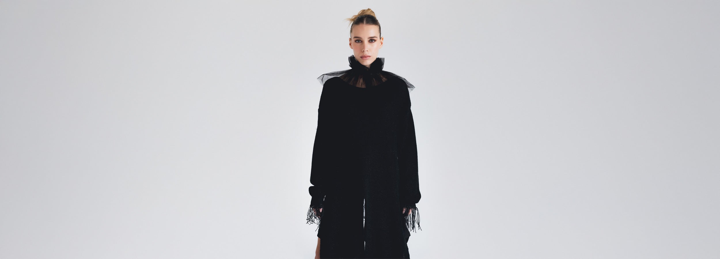 Adding an element of drama and sophistication, the sheer tulle collar is crafted with a controlled gathering technique, creating volume around the face. Its black hue complements the look's palette, while its transparency and delicacy balance the solidity of the knit and fringes. This detail elevates the look and reinforces the design's narrative, evoking a refined and ethereal aesthetic.