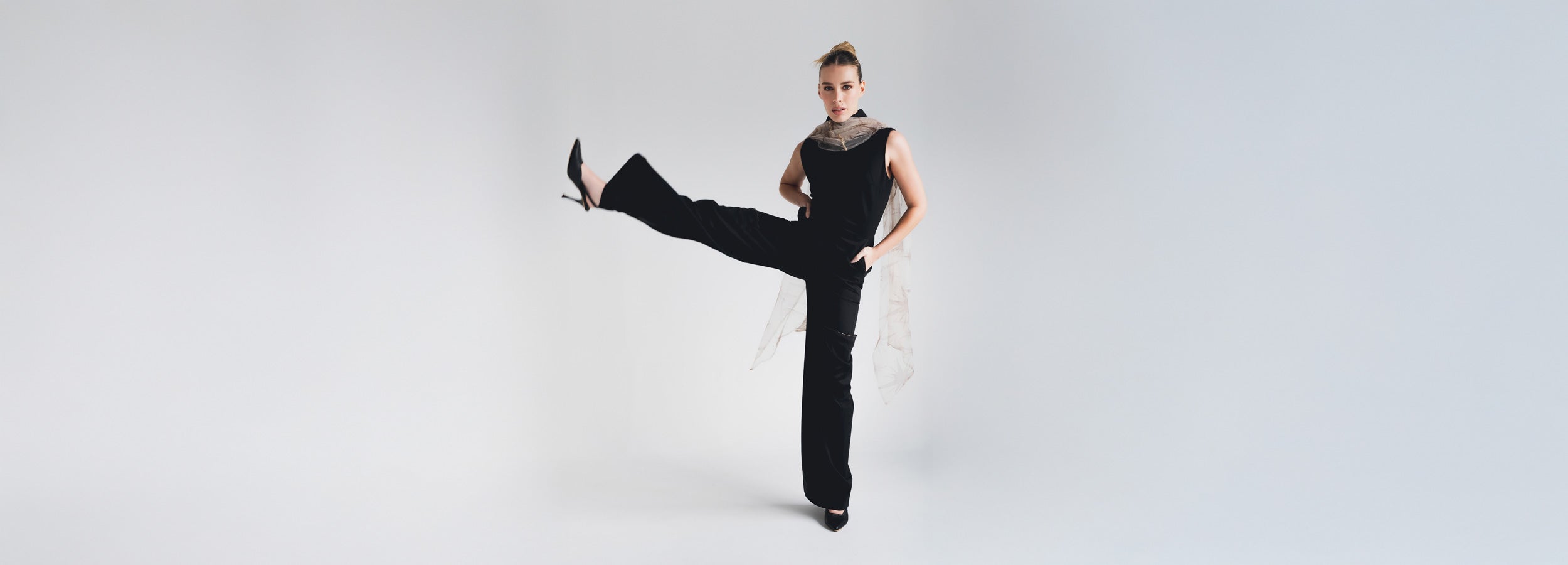 The NOCTURNA look is an ode to black, an all-encompassing color that envelops you with an aura of mystery and elegance. Hidden, magical details are revealed through subtle transparencies that add an ethereal touch, creating a fascinating interplay between the visible and the hidden. The impeccable structure and geometric cuts provide a captivating dynamism, while the handcrafted elements enhance the sophistication of the ensemble.