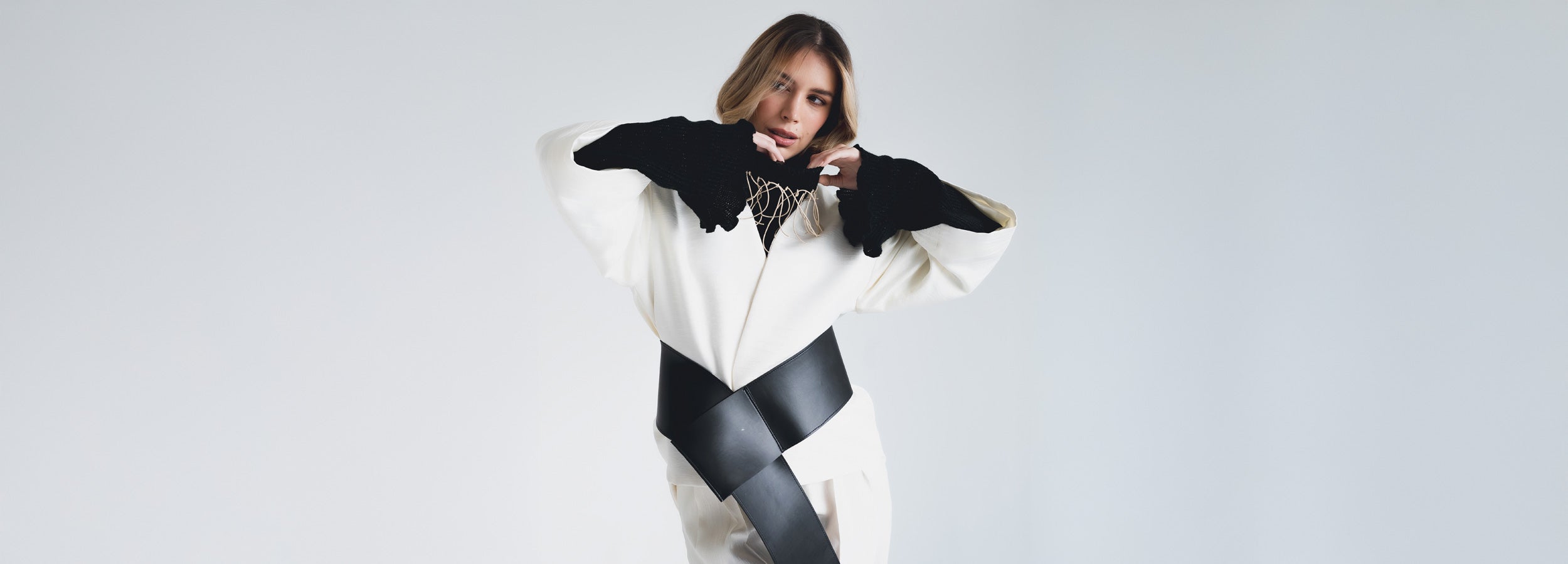 The ORIONIS look is a symphony of colors and textures intertwined in perfect harmony. With a focus on hand embroidery that adds an artisanal touch, this ensemble celebrates elegance through the subtlety of its hues. The mix of fabrics and fluid silhouettes create visual balance, while carefully designed details evoke sophistication and contemporary style.