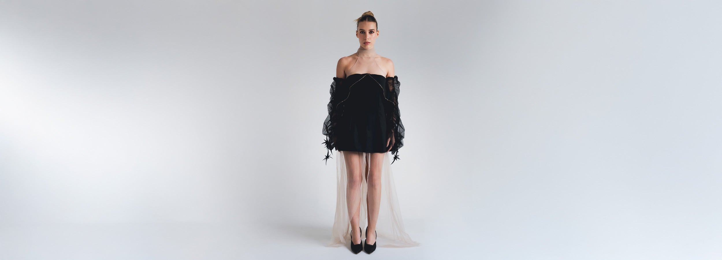 The PHOENIX look is a double-impact statement that fuses texture, structure, and sheerness into a captivating dress. Divided into two sections, this design features delicate sheer layers and a darted top that elegantly frames the feminine silhouette. The contrast between the deep black and the sheer areas subtly highlights the figure, while the hand embroidery adds a touch of sophistication and artisanal detail.